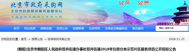 2018年11月23日,北京市朝陽區(qū)雙井街道2019年垃圾分類示范片區(qū)服務項目發(fā)布公開招標公告。