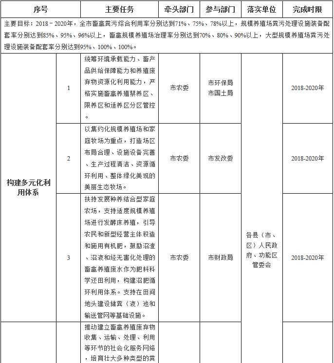 (二)主要目標(biāo)。到2019年,大型規(guī)模養(yǎng)殖場糞污處理設(shè)施裝備配套率達(dá)到100%;到2020年,建立科學(xué)規(guī)范、權(quán)責(zé)清晰、約束有力的畜禽養(yǎng)殖廢棄物資源化利用體系,構(gòu)建種養(yǎng)循環(huán)發(fā)展機制,全市畜禽糞污綜合利用率達(dá)到78%以上,規(guī)模養(yǎng)殖場糞污處理設(shè)施裝備配套率達(dá)到96%以上,規(guī)模養(yǎng)殖場治理率達(dá)到90%以上。