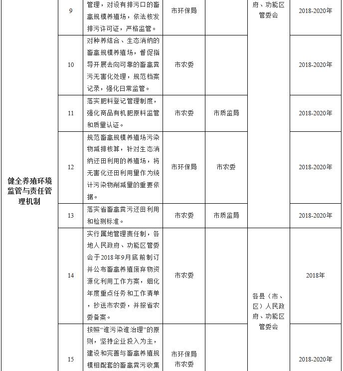 (九)堅持屬地責(zé)任管理。畜禽養(yǎng)殖廢棄物資源化利用實行屬地管理責(zé)任制,各地人民政府、功能區(qū)管委會對本行政區(qū)域內(nèi)的畜禽養(yǎng)殖廢棄物資源化利用工作負(fù)總責(zé),強化組織領(lǐng)導(dǎo),明確部門職責(zé),建立協(xié)調(diào)機制,加強政策扶持,強化日常監(jiān)管,健全督查制度和巡查機制,確保各項任務(wù)落實到位。堅持保供給與保生態(tài)并重,落實“菜籃子”市長負(fù)責(zé)制,統(tǒng)籌環(huán)境保護與畜牧業(yè)協(xié)調(diào)發(fā)展。各縣(市、區(qū))人民政府、功能區(qū)管委會應(yīng)于2018年10月底前制訂并公布畜禽養(yǎng)殖廢棄物資源化利用工作方案,細(xì)化年度重點任務(wù)和工作清單,抄送市農(nóng)委,并報省農(nóng)委備案。