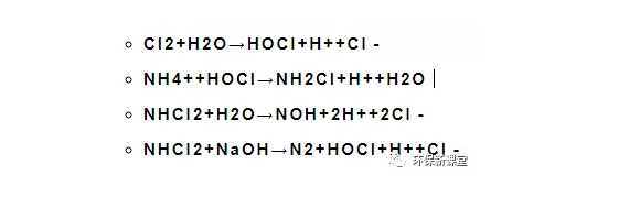 折點(diǎn)加氯法處理后的出水在排放前一般需要用活性碳或二氧化硫進(jìn)行反氯化,以去除水中殘留的氯。1mg殘留氯大約需要0.9~1.0mg的二氧化硫。在反氯化時(shí)會(huì)產(chǎn)生氫離子,但由此引起的pH值下降一般可以忽略,因此去除1mg殘留氯只消耗2mg左右(以CaCO3計(jì))。折點(diǎn)氯化法除氨機(jī)理如下:
