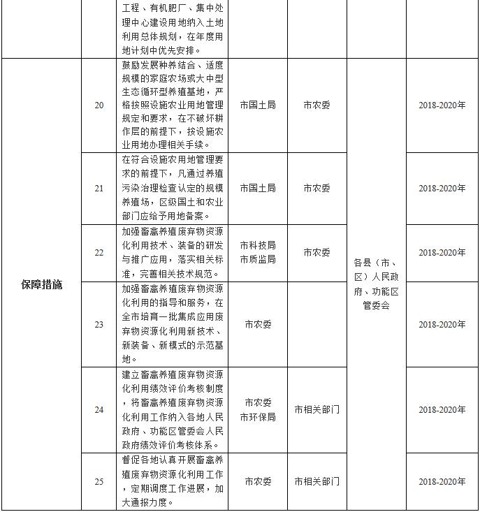(九)堅持屬地責(zé)任管理。畜禽養(yǎng)殖廢棄物資源化利用實行屬地管理責(zé)任制,各地人民政府、功能區(qū)管委會對本行政區(qū)域內(nèi)的畜禽養(yǎng)殖廢棄物資源化利用工作負(fù)總責(zé),強化組織領(lǐng)導(dǎo),明確部門職責(zé),建立協(xié)調(diào)機制,加強政策扶持,強化日常監(jiān)管,健全督查制度和巡查機制,確保各項任務(wù)落實到位。堅持保供給與保生態(tài)并重,落實“菜籃子”市長負(fù)責(zé)制,統(tǒng)籌環(huán)境保護與畜牧業(yè)協(xié)調(diào)發(fā)展。各縣(市、區(qū))人民政府、功能區(qū)管委會應(yīng)于2018年10月底前制訂并公布畜禽養(yǎng)殖廢棄物資源化利用工作方案,細(xì)化年度重點任務(wù)和工作清單,抄送市農(nóng)委,并報省農(nóng)委備案。