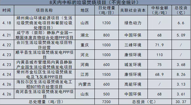 中國固廢網(wǎng)從E20環(huán)境平臺(tái)標(biāo)訊采集系統(tǒng)(信息來源:全國各級政府采購網(wǎng)/公共資源交易平臺(tái))獲悉,4月18日至4月26日的8天內(nèi),已有8個(gè)垃圾焚燒項(xiàng)目敲定了(預(yù))中標(biāo)的社會(huì)資本方,包括綠色動(dòng)力、三峰環(huán)境、城發(fā)環(huán)境、康恒環(huán)境、中國環(huán)保、高能環(huán)境在內(nèi)的企業(yè)都分得了焚燒市場的“一杯羹”...