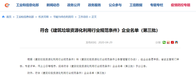 日前,工信部發(fā)布符合《建筑垃圾資源化利用行業(yè)規(guī)范條件》企業(yè)名單(第三批)。共涉及五家企業(yè)。 中華人民共和國工業(yè)和信息化部 中華人民共和國住房和城鄉(xiāng)建設(shè)部公告 2020年 第14號 根據(jù)《建筑垃圾資源化利用行業(yè)規(guī)范條件》和《建筑垃圾資源化行業(yè)規(guī)范條件公告管理暫行辦法》,經(jīng)企業(yè)自愿申報(bào)、省級主管部門審核...