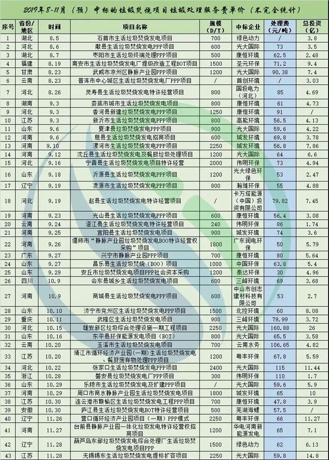 近幾個月,垃圾焚燒項目接連放出中標(biāo)結(jié)果,其中不少項目的垃圾處理服務(wù)費(fèi)價格喜人,引來業(yè)內(nèi)廣泛關(guān)注。 10月15日,河北省雄安新區(qū)垃圾綜合處理設(shè)施一期工程項目發(fā)布中標(biāo)公告,光大國際有限公司成為中標(biāo)的社會資本方,中標(biāo)金額160.88元/噸; 10月20日,云南省玉溪市生活垃圾焚燒發(fā)電項目發(fā)布中標(biāo)公告,云南...