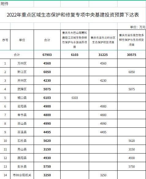 重慶市財政局關(guān)于下達2022年重點區(qū)域生態(tài)保護和修復(fù)專項中央基建投資預(yù)算的通知有關(guān)區(qū)縣(自治縣)財政局,市林業(yè)局: 根據(jù)《財政部關(guān)于下達2022年重點區(qū)域生態(tài)保護和修復(fù)專項(第一批)中央基建投資預(yù)算的通知》(財建〔2022〕127號)、《財政部關(guān)于下達2022年重點區(qū)域生態(tài)保護和修復(fù)專項(第二批)中...
