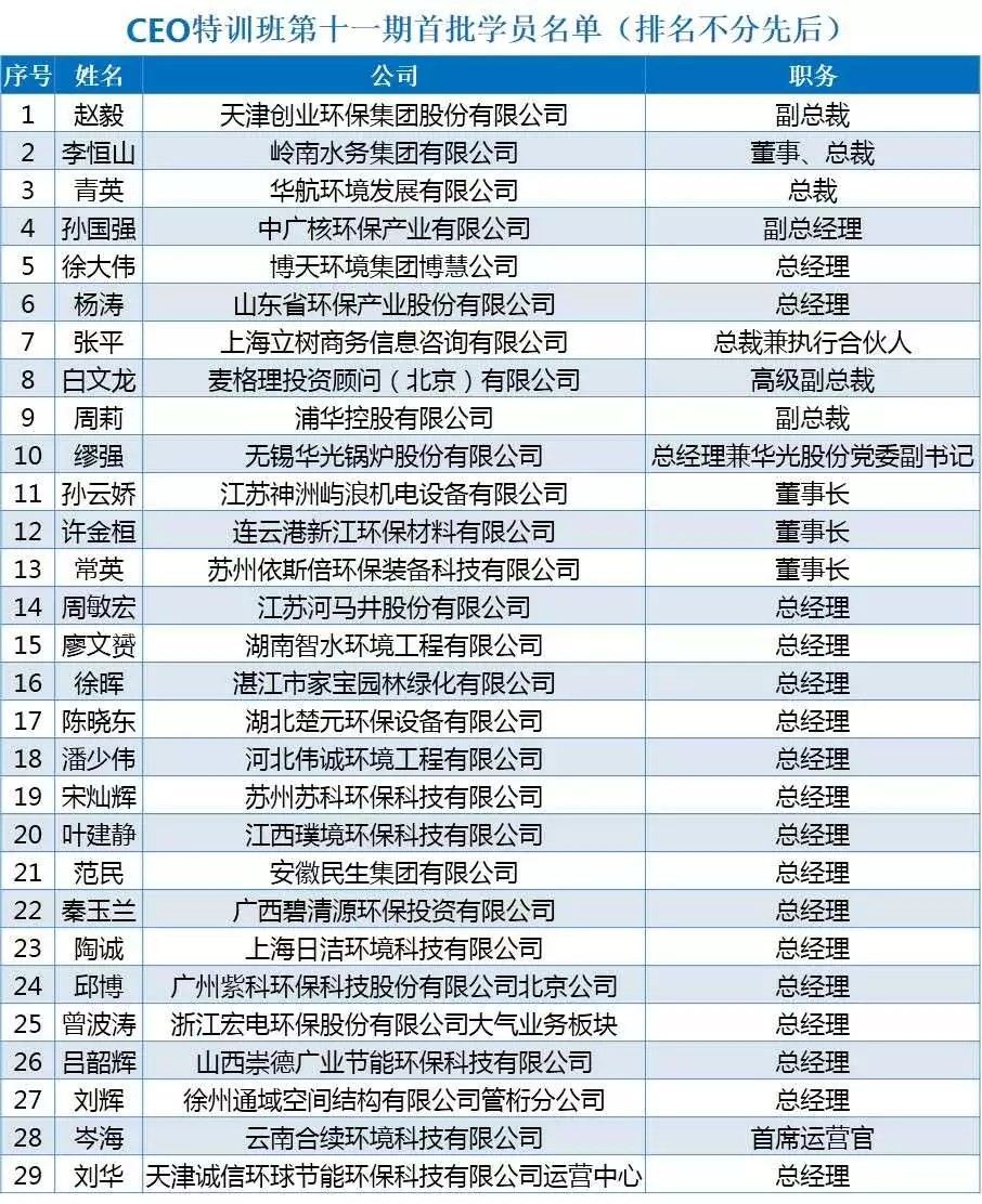 環(huán)境產(chǎn)業(yè)CEO特訓(xùn)班第十一期將于5月初在京開(kāi)班。經(jīng)過(guò)E20環(huán)境商學(xué)院的嚴(yán)格篩選與審核,第11期首批學(xué)員名單終于與大家見(jiàn)面,詳情見(jiàn)下文。環(huán)境產(chǎn)業(yè)CEO特訓(xùn)班第十一期首批名單來(lái)了,將于5月初在京開(kāi)班。相信大家已經(jīng)迫不及待想要了解本期學(xué)員都有誰(shuí)。經(jīng)過(guò)E20環(huán)境商學(xué)院的嚴(yán)格篩選與審核,第11期首批學(xué)員名單終...