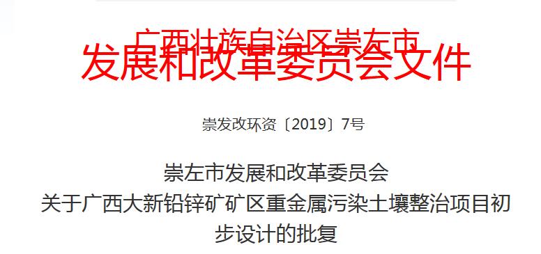 崇發(fā)改環(huán)資〔2019〕7號(hào)崇左市發(fā)展和改革委員會(huì)關(guān)于廣西大新鉛鋅礦礦區(qū)重金屬污染土壤整治項(xiàng)目初步設(shè)計(jì)的批復(fù)大新縣發(fā)展和改革局:報(bào)來(lái)《關(guān)于請(qǐng)求審批廣西大新鉛鋅礦礦區(qū)重金屬污染土壤整治項(xiàng)目初步設(shè)計(jì)的請(qǐng)示》(新發(fā)改報(bào)〔2019〕16號(hào))及相關(guān)材料收悉,該項(xiàng)目已經(jīng)由深圳市華倫投資咨詢有限公司審查并出具審查報(bào)...