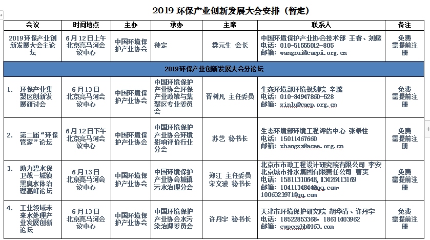 為深入貫徹落實(shí)習(xí)近平生態(tài)文明思想和綠色發(fā)展理念,促進(jìn)國內(nèi)外環(huán)保產(chǎn)業(yè)界的交流和合作,中國環(huán)保產(chǎn)業(yè)協(xié)會(huì)會(huì)將于2019年6月在京舉辦“2019環(huán)保產(chǎn)業(yè)創(chuàng)新發(fā)展大會(huì)”。大會(huì)主題為“高質(zhì)量發(fā)展環(huán)保產(chǎn)業(yè),助力打好污染防治攻堅(jiān)戰(zhàn)”,設(shè)主論壇和20余個(gè)平行分論壇,擬邀請(qǐng)生態(tài)環(huán)境部、發(fā)改委、科技部、工信部、住建部等政...