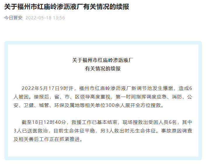 據(jù)福州市晉安區(qū)人民政府辦公室消息,5月17日9時許,福州市紅廟嶺滲瀝液廠新調(diào)節(jié)池發(fā)生爆燃,造成6人被困。接報后,福建省、福州市、晉安區(qū)領(lǐng)導(dǎo)高度重視,第一時間指揮調(diào)度應(yīng)急、消防、公安、衛(wèi)健、城管、環(huán)保及屬地等相關(guān)單位300余人展開全方位搜救。截至18日12時40分,救援工作已基本結(jié)束,現(xiàn)場搜救出受困人...