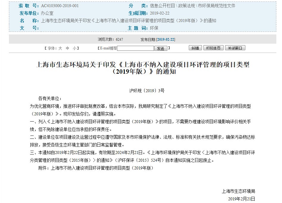 文章導讀“全市超過1/4的建設項目將不需要辦理環(huán)評手續(xù)了?!庇浾呓諒纳虾J猩鷳B(tài)環(huán)境局了解到,最新出臺的《上海市不納入建設項目環(huán)評管理的項目類型(2019年版)》以正面清單方式,明確了上海市范圍內不納入建設項目環(huán)評管理的項目類型。來源:中國環(huán)境報 據上海市生態(tài)環(huán)境局介紹,《豁免名錄》實施后,上海超過...