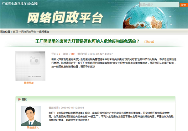 工廠照明用的廢熒光燈管是否也可納入危險(xiǎn)廢物豁免清單?官方這樣回復(fù)!