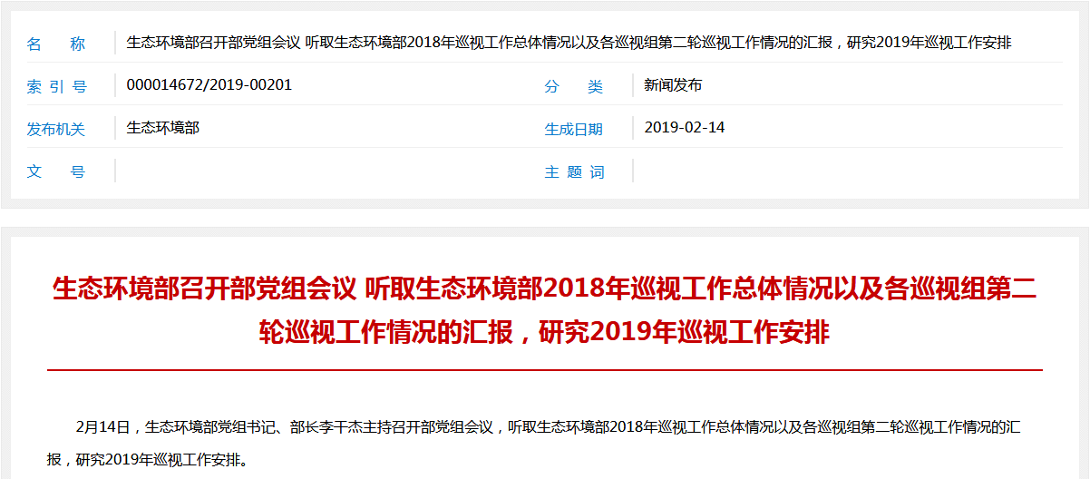 2月14日,生態(tài)環(huán)境部黨組書記、部長李干杰主持召開部黨組會(huì)議,聽取生態(tài)環(huán)境部2018年巡視工作總體情況以及各巡視組第二輪巡視工作情況的匯報(bào),研究2019年巡視工作安排。會(huì)議指出,巡視工作是落實(shí)全面從嚴(yán)治黨主體責(zé)任、加強(qiáng)領(lǐng)導(dǎo)班子和干部隊(duì)伍建設(shè)的重要抓手。黨的十九大以來,生態(tài)環(huán)境部黨組研究制定巡視工作五...