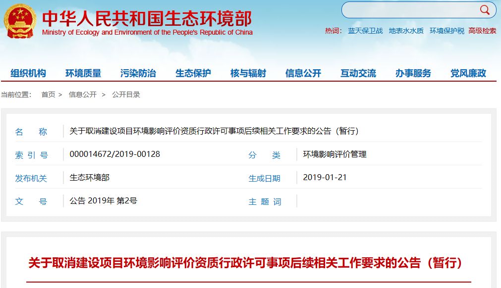 關(guān)于取消建設(shè)項(xiàng)目環(huán)境影響評價(jià)資質(zhì)行政許可事項(xiàng)后續(xù)相關(guān)工作要求的公告(暫行) 《全國人民代表大會常務(wù)委員會關(guān)于修改〈中華人民共和國勞動法〉等七部法律的決定》(中華人民共和國主席令第二十四號)已于2018年12月29日公布施行,對《中華人民共和國環(huán)境影響評價(jià)法》作出修改,取消了建設(shè)項(xiàng)目環(huán)境影響評價(jià)資質(zhì)行...