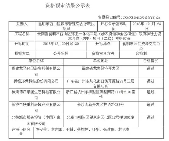 據(jù)中國政府采購網(wǎng)消息,云南省昆明市西山區(qū)環(huán)衛(wèi)一體化二期(涉農(nóng)街道和全區(qū)河道)PPP)項目(二次)發(fā)布資格預(yù)審結(jié)果,福建龍馬環(huán)衛(wèi)裝備股份有限公司、僑銀環(huán)保科技股份有限公司、杭州錦江集團生態(tài)科技有限公司、長沙中聯(lián)重科環(huán)境產(chǎn)業(yè)有限公司、北控城市服務(wù)投資(中國)集團有限公司等五家環(huán)衛(wèi)知名企業(yè)通過資格預(yù)審。 ...