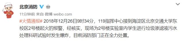 北京市公安局消防局官方微博剛剛發(fā)布火情通報,2018年12月26日9時34分,119指揮中心接到海淀區(qū)北京交通大學(xué)東校區(qū)2號樓起火的報警,經(jīng)核實,現(xiàn)場為2號樓實驗室內(nèi)學(xué)生進行垃圾滲濾液污水處理科研試驗時發(fā)生爆炸,目前消防部門正在全力處置。