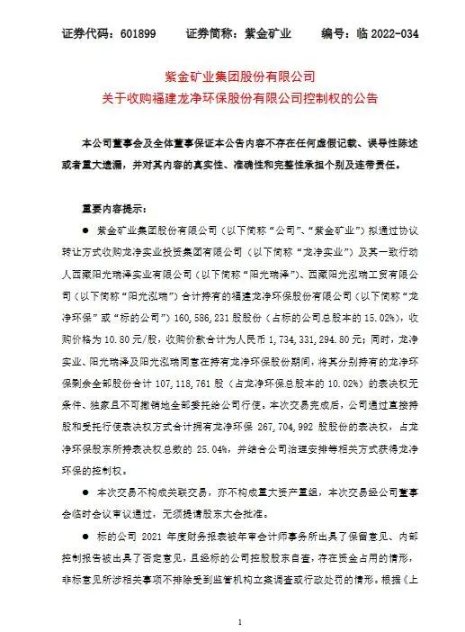 熱點(diǎn) | 龍凈環(huán)保將易主!紫金礦業(yè)擬17.34億元收購龍凈環(huán)保15.02%股份并獲取其控制權(quán)