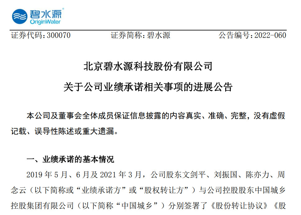 碧水源業(yè)績(jī)承諾未完成,文劍平等需補(bǔ)償支付10個(gè)億!