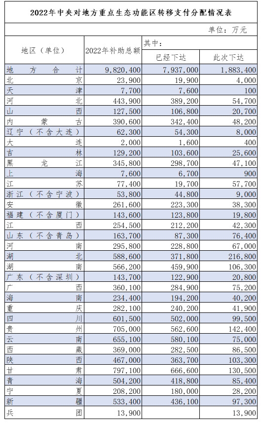 據(jù)財政部網(wǎng)站消息,為推進生態(tài)文明建設(shè),引導(dǎo)地方政府加強生態(tài)環(huán)境保護,提高生態(tài)功能重要地區(qū)基本公共服務(wù)保障能力,近日,財政部下達2022年重點生態(tài)功能區(qū)轉(zhuǎn)移支付預(yù)算188.34億元,加上此前已下達部分,已累計下達預(yù)算982.04億元。 原標(biāo)題:財政部下達資金188.34億元 引導(dǎo)地方政府加強生態(tài)環(huán)境保...