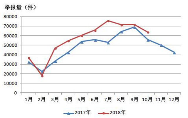 2018年10月,全國環(huán)保舉報(bào)管理平臺(tái)共接到環(huán)保舉報(bào)63883件,已受理54305件。其中,“12369”環(huán)保舉報(bào)熱線電話共31354件,微信舉報(bào)25831件,網(wǎng)上舉報(bào)6698件。從污染類型來看,10月大氣污染、噪聲污染舉報(bào)較多。 一、秋冬季舉報(bào)出現(xiàn)下降趨勢(shì) 2018年10月...