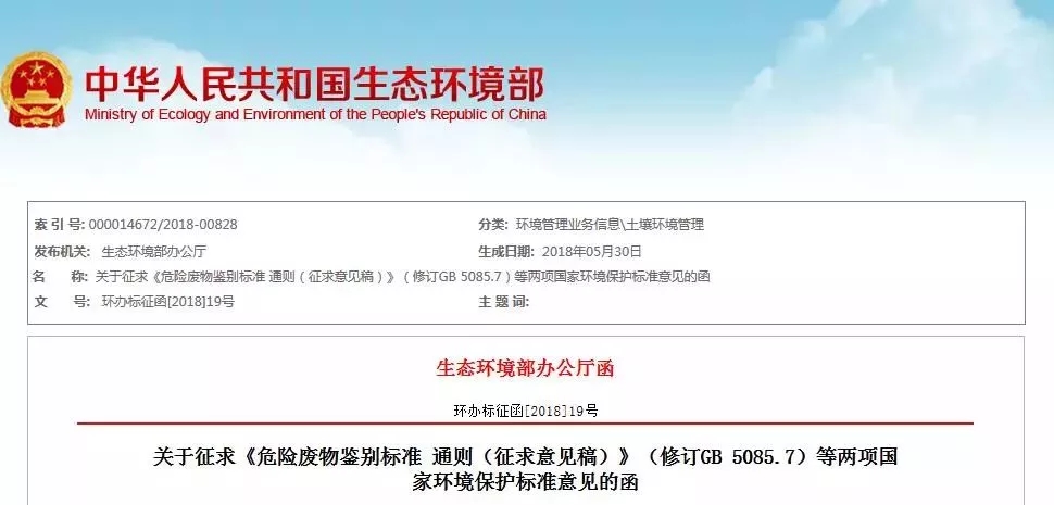 為貫徹《中華人民共和國環(huán)境保護(hù)法》《中華人民共和國固體廢物污染環(huán)境防治法》,防治危險廢物造成的環(huán)境污染,加強(qiáng)對危險廢物的管理,保護(hù)環(huán)境,保障公眾健康,生態(tài)環(huán)境部修訂形成了國家環(huán)境保護(hù)標(biāo)準(zhǔn)《危險廢物鑒別標(biāo)準(zhǔn) 通則(征求意見稿)》(GB 5085.7)、《危險廢物鑒別技術(shù)規(guī)范(征求意見稿)》(HJ/T ...