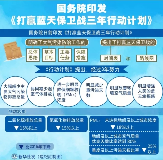 經(jīng)李克強(qiáng)總理簽批,國務(wù)院日前印發(fā)《打贏藍(lán)天保衛(wèi)戰(zhàn)三年行動計劃》(以下簡稱《行動計劃》),明確了大氣污染防治工作的總體思路、基本目標(biāo)、主要任務(wù)和保障措施,提出了打贏藍(lán)天保衛(wèi)戰(zhàn)的時間表和路線圖。來源:新華社、中國政府網(wǎng)圖表:國務(wù)院印發(fā)《打贏藍(lán)天保衛(wèi)戰(zhàn)三年行動計劃》新華社發(fā) 邊紀(jì)紅 制圖《行動計劃》指出,...