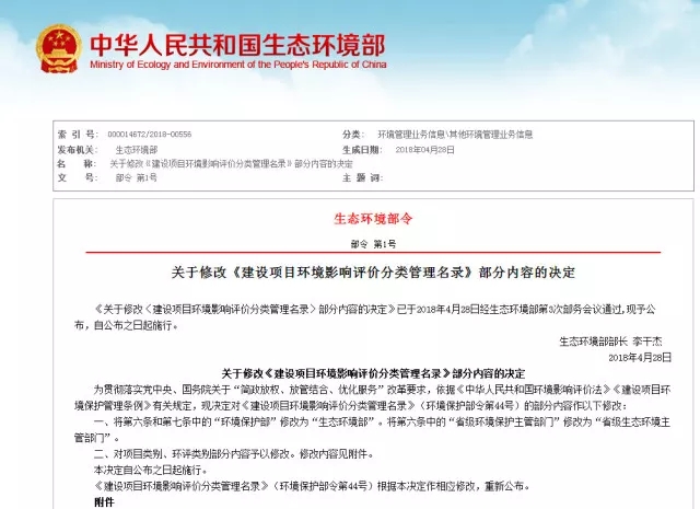 生態(tài)環(huán)境部2018年第3次部務(wù)會(huì)審議并通過了《關(guān)于修改<建設(shè)項(xiàng)目環(huán)境影響評(píng)價(jià)分類管理名錄>部分內(nèi)容的決定》,對(duì)《建設(shè)項(xiàng)目環(huán)境影響評(píng)價(jià)分類管理名錄》(環(huán)境保護(hù)部令第44號(hào))的部分內(nèi)容予以修改,并于公布之日起實(shí)施。來源:生態(tài)環(huán)境部修改《建設(shè)項(xiàng)目環(huán)境影響評(píng)價(jià)分類管理名錄》,是落實(shí)習(xí)近平總書記重...