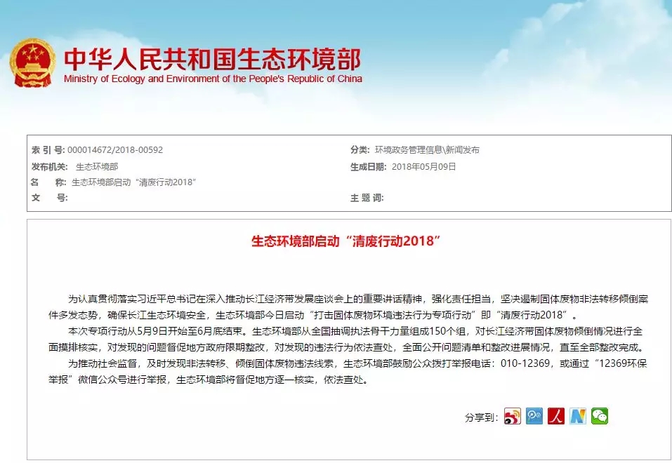 為遏制長江流域固體廢物非法轉(zhuǎn)移傾倒案件多發(fā)態(tài)勢,及時(shí)消除環(huán)境安全隱患,保障長江生態(tài)環(huán)境安全,生態(tài)環(huán)境部決定組織開展打擊固體廢物環(huán)境違法行為專項(xiàng)行動(dòng)。從有關(guān)?。▍^(qū)、市)環(huán)保系統(tǒng)抽調(diào)人員,組成150個(gè)專項(xiàng)行動(dòng)督查組,對(duì)長江經(jīng)濟(jì)帶11?。ㄊ校?400多個(gè)固體廢物堆存點(diǎn)位進(jìn)行現(xiàn)場核查督導(dǎo)。這場名為“清廢行動(dòng)...