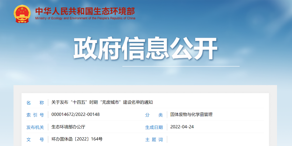 關(guān)于發(fā)布“十四五”時(shí)期“無(wú)廢城市”建設(shè)名單的通知各省、自治區(qū)、直轄市生態(tài)環(huán)境廳(局): 為落實(shí)《中共中央 國(guó)務(wù)院關(guān)于深入打好污染防治攻堅(jiān)戰(zhàn)的意見》和《“十四五”時(shí)期“無(wú)廢城市”建設(shè)工作方案》(以下簡(jiǎn)稱《工作方案》),我部會(huì)同有關(guān)部門,根據(jù)各省份推薦情況,綜合考慮城市基礎(chǔ)條件、工作積極性和國(guó)家相關(guān)重大...
