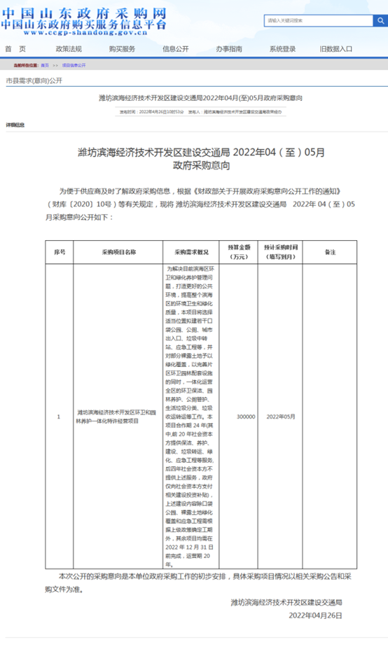 采購(gòu)項(xiàng)目名稱:濰坊濱海經(jīng)濟(jì)技術(shù)開發(fā)區(qū)環(huán)衛(wèi)和園林養(yǎng)護(hù)一體化特許經(jīng)營(yíng)項(xiàng)目預(yù)算金額:300000(萬(wàn)元)預(yù)計(jì)采購(gòu)時(shí)間:2022年05月采購(gòu)需求概況:為解決目前濱海區(qū)環(huán)衛(wèi)和綠化養(yǎng)護(hù)管理問題,打造更好的公共環(huán)境,提高整個(gè)濱海區(qū)的環(huán)境衛(wèi)生和綠化質(zhì)量,本項(xiàng)目將選擇適當(dāng)位置擬建若干口袋公園、公廁、城市出入口、垃圾中...