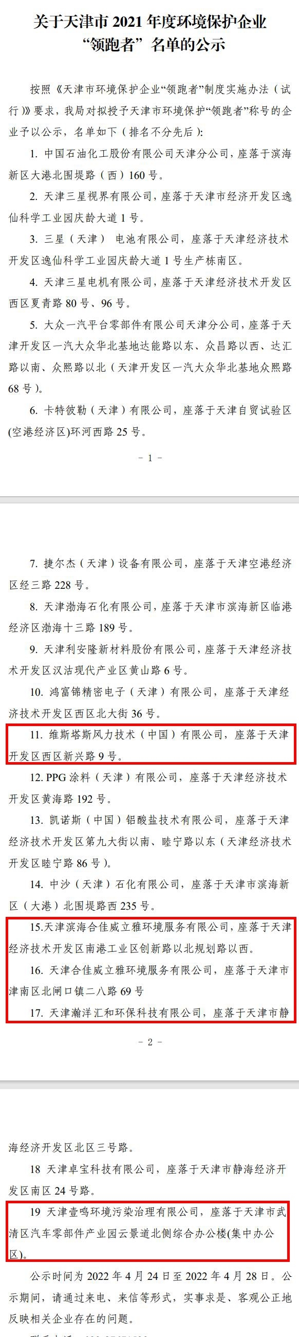 2022年4月24日至4月28日是天津2021年環(huán)保企業(yè)領(lǐng)跑者名單公示期,涉及19家企業(yè),包括維斯塔斯風(fēng)力技術(shù)(中國(guó))有限公司、天津?yàn)I海合佳威立雅環(huán)境服務(wù)有限公司、天津合佳威立雅環(huán)境服務(wù)有限公司、天津瀚洋匯和環(huán)??萍加邢薰竞吞旖蛞鉴Q環(huán)境污染治理有限公司。