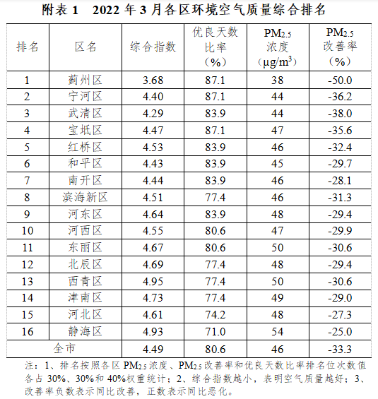2022年3月及第一季度天津市各區(qū)環(huán)境空氣質(zhì)量狀況發(fā)布
