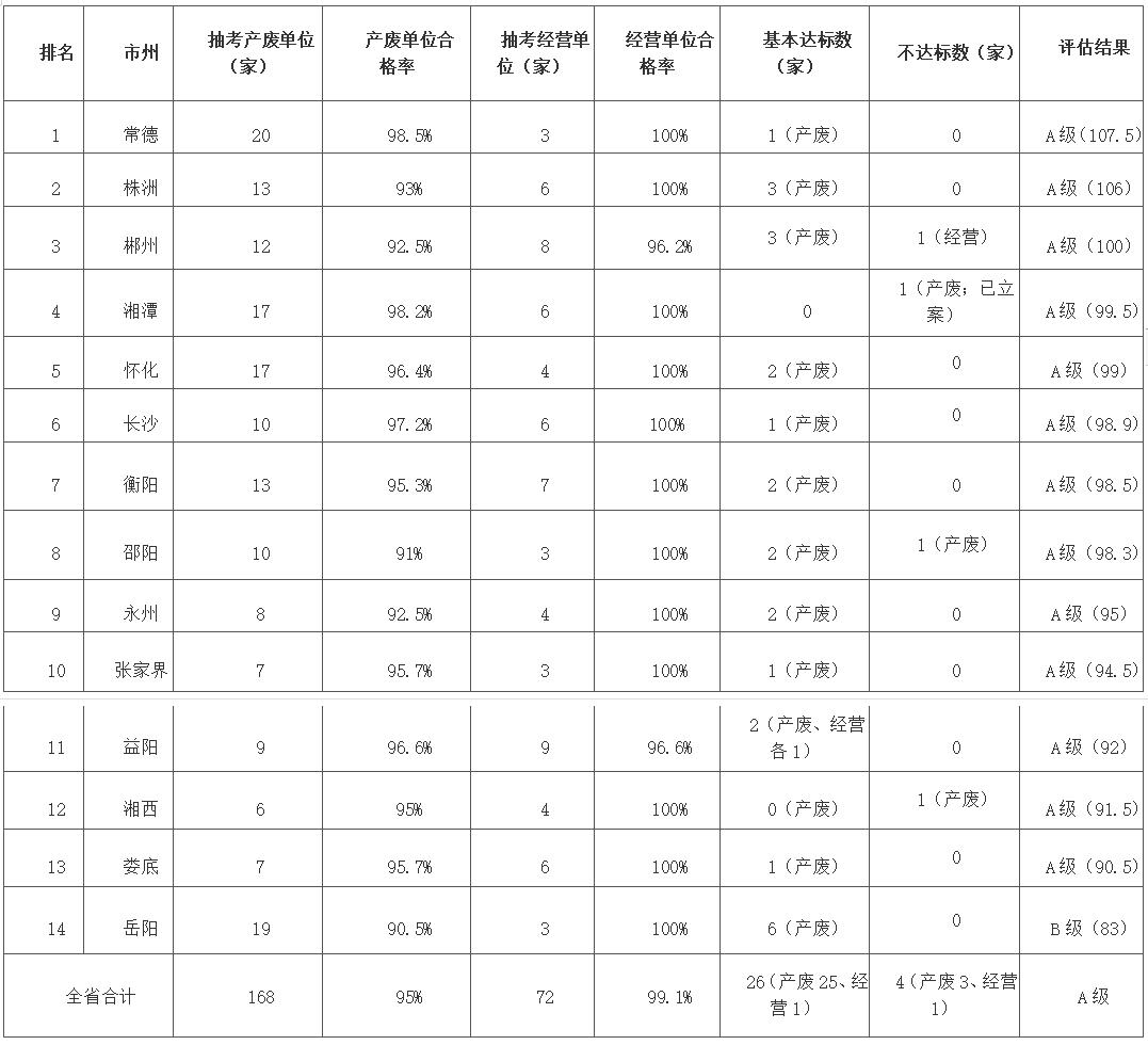 關(guān)于湖南省2021年度危險(xiǎn)廢物規(guī)范化環(huán)境管理評(píng)估結(jié)果的公示 根據(jù)生態(tài)環(huán)境部《“十四五”全國(guó)危險(xiǎn)廢物規(guī)范化環(huán)境管理評(píng)估工作方案》相關(guān)要求,我廳于今年年初,組織對(duì)全省14個(gè)市州2021年度危險(xiǎn)廢物規(guī)范化環(huán)境管理工作進(jìn)行了評(píng)估,現(xiàn)將相關(guān)情況公示如下: 省級(jí)評(píng)估,共計(jì)對(duì)14個(gè)市州16...