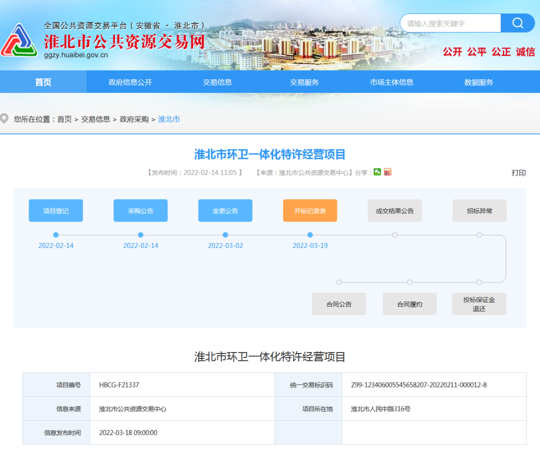 淮北市公共資源交易網(wǎng)消息,2022年3月19日,備受業(yè)內(nèi)關(guān)注的淮北市環(huán)衛(wèi)一體化特許經(jīng)營(yíng)項(xiàng)目公布開(kāi)標(biāo)記錄表,共有40家企業(yè)投標(biāo)。 中環(huán)潔、康潔科技集團(tuán)、北控城市服務(wù)、中聯(lián)環(huán)境、福龍馬、僑銀股份、保利物業(yè)、福建東飛環(huán)境、啟迪環(huán)境、家寶園林、勁旅環(huán)境、徐工環(huán)境、中節(jié)能、傲藍(lán)得、美欣達(dá)、高能時(shí)代等眾多知名企...