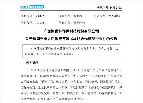 近日,博世科(300422.SZ)發(fā)布公告,公司及控股股東廣州環(huán)保投資集團(tuán)有限公司(簡(jiǎn)稱“廣州環(huán)投集團(tuán)”)作為乙方與南寧市人民政府(甲方)近日簽署了《戰(zhàn)略合作框架協(xié)議》,擬就南寧市生活垃圾焚燒、智慧環(huán)衛(wèi)、固廢處理、水環(huán)境治理、環(huán)保裝備制造、土壤修復(fù)治理、環(huán)保技術(shù)服務(wù)等領(lǐng)域開(kāi)展項(xiàng)目合作。 協(xié)議內(nèi)容顯示...