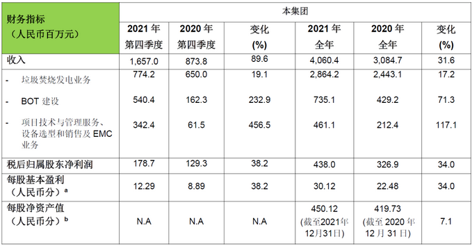浙能錦江環(huán)境公布2021年全年業(yè)績,2021年全年收入同比增加31.6%至人民幣40.6億元,垃圾焚燒發(fā)電收入同比增長17.2%,稅后歸屬股東凈利潤同比增長34.0%至人民幣4.4億元。 a)2021年第四季度和全年以及2020年第四季度和全年,每股盈利是根據(jù)加權(quán)平均股數(shù)來計算的。b)2021年12...