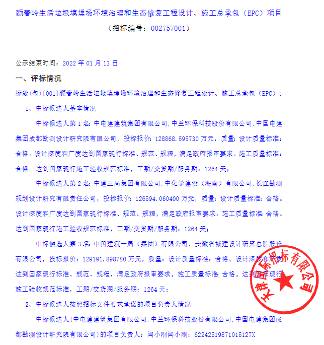 日前,中國招標投標公共服務(wù)平臺發(fā)布海南省顏春嶺生活垃圾填埋場環(huán)境治理和生態(tài)修復(fù)工程設(shè)計、施工總承包(EPC)項目中標公示,中電建建筑集團有限公司、中蘭環(huán)??萍脊煞萦邢薰竞椭袊娊瘓F成都勘測設(shè)計研究院有限公司組成的聯(lián)合體中標該項目,中標金額約12.9億元。 來源 | 環(huán)衛(wèi)科技網(wǎng)(ID: cnhua...