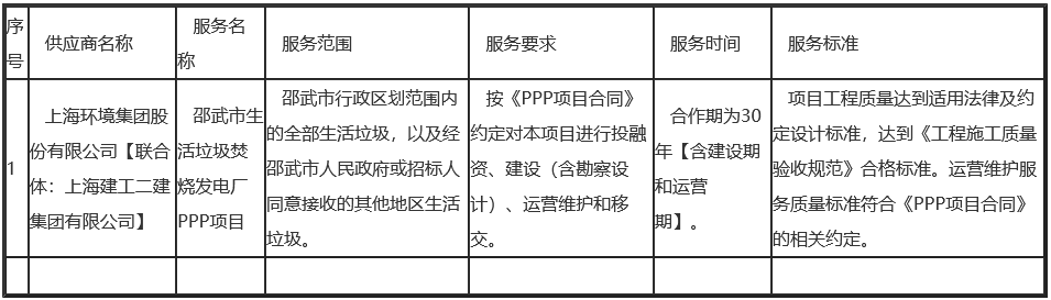 邵武市生活垃圾焚燒發(fā)電廠PPP項目發(fā)布中標公告,上海環(huán)境集團股份有限公司聯(lián)合上海建工二建集團有限公司中標該項目。 詳情如下: 一、項目編號:FJTP-00092118015206(招標文件編號:FJTP-00092118015206)二、項目名稱:邵武市生活垃圾焚燒發(fā)電廠PPP項目三、中標(成交)信...