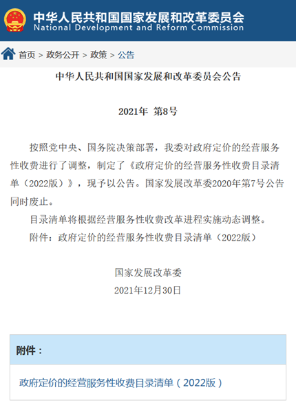 國家發(fā)展改革委官網(wǎng)1月6日消息,2021年12月30日,發(fā)改委發(fā)布《中華人民共和國國家發(fā)展和改革委員會公告》(2021年 第8號),按照黨中央、國務(wù)院決策部署,國家發(fā)展改革委對政府定價的經(jīng)營服務(wù)性收費(fèi)進(jìn)行了調(diào)整,制定并發(fā)布《政府定價的經(jīng)營服務(wù)性收費(fèi)目錄清單(2022版)》。 目錄清單中涉及北京、山西...