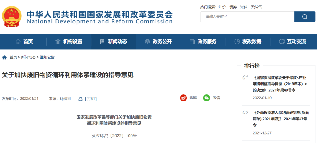 近日,國家發(fā)展改革委、商務(wù)部、工業(yè)和信息化部、財(cái)政部、自然資源部、生態(tài)環(huán)境部和住房城鄉(xiāng)建設(shè)部聯(lián)合印發(fā)《關(guān)于加快廢舊物資循環(huán)利用體系建設(shè)的指導(dǎo)意見》(發(fā)改環(huán)資﹝2022﹞109號,《指導(dǎo)意見》提出,到2025年,廢舊物資回收網(wǎng)絡(luò)體系基本建立,建成綠色分揀中心1000個以上。 《指導(dǎo)意見》強(qiáng)調(diào),建立健全...