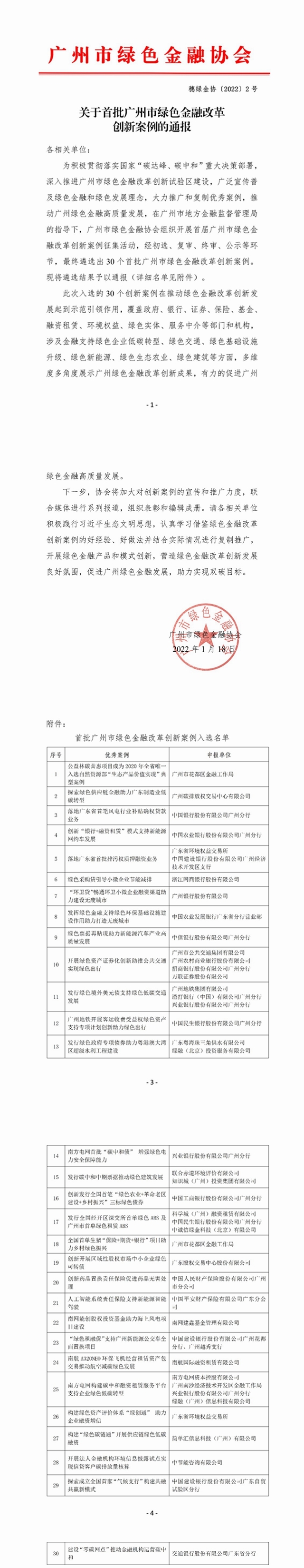 近日,廣州市綠色金融協(xié)會正式公布首批廣州市綠色金融改革創(chuàng)新案例征集活動遴選結(jié)果,最終遴選出30個首批廣州市綠色金融改革創(chuàng)新案例。 此次入選的30個創(chuàng)新案例在推動綠色金融改革創(chuàng)新發(fā)展起到示范引領(lǐng)作用,覆蓋政府、銀行、證券、保險、基金、融資租賃、環(huán)境權(quán)益、綠色實體、服務(wù)中介等部門和機構(gòu),涉及金融支持綠色...