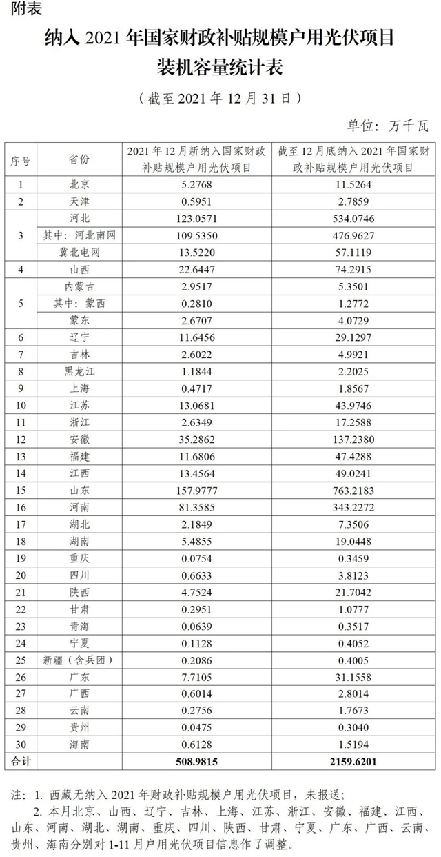 按照《國家能源局關(guān)于2021年風電、光伏發(fā)電開發(fā)建設(shè)有關(guān)事項的通知》(國能發(fā)新能〔2021〕25號)和《國家能源局綜合司關(guān)于2019年戶用光伏項目信息公布和報送有關(guān)事項的通知》(國能綜通新能〔2019〕45號)關(guān)于戶用光伏項目管理有關(guān)要求,全國共有30個省份報送了戶用光伏項目信息(西藏無納入2021...
