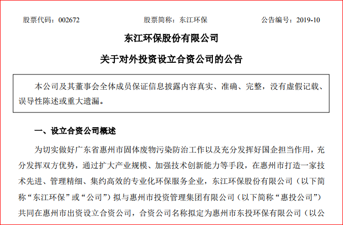 東江環(huán)保擬出資6000萬在惠州成立合資公司