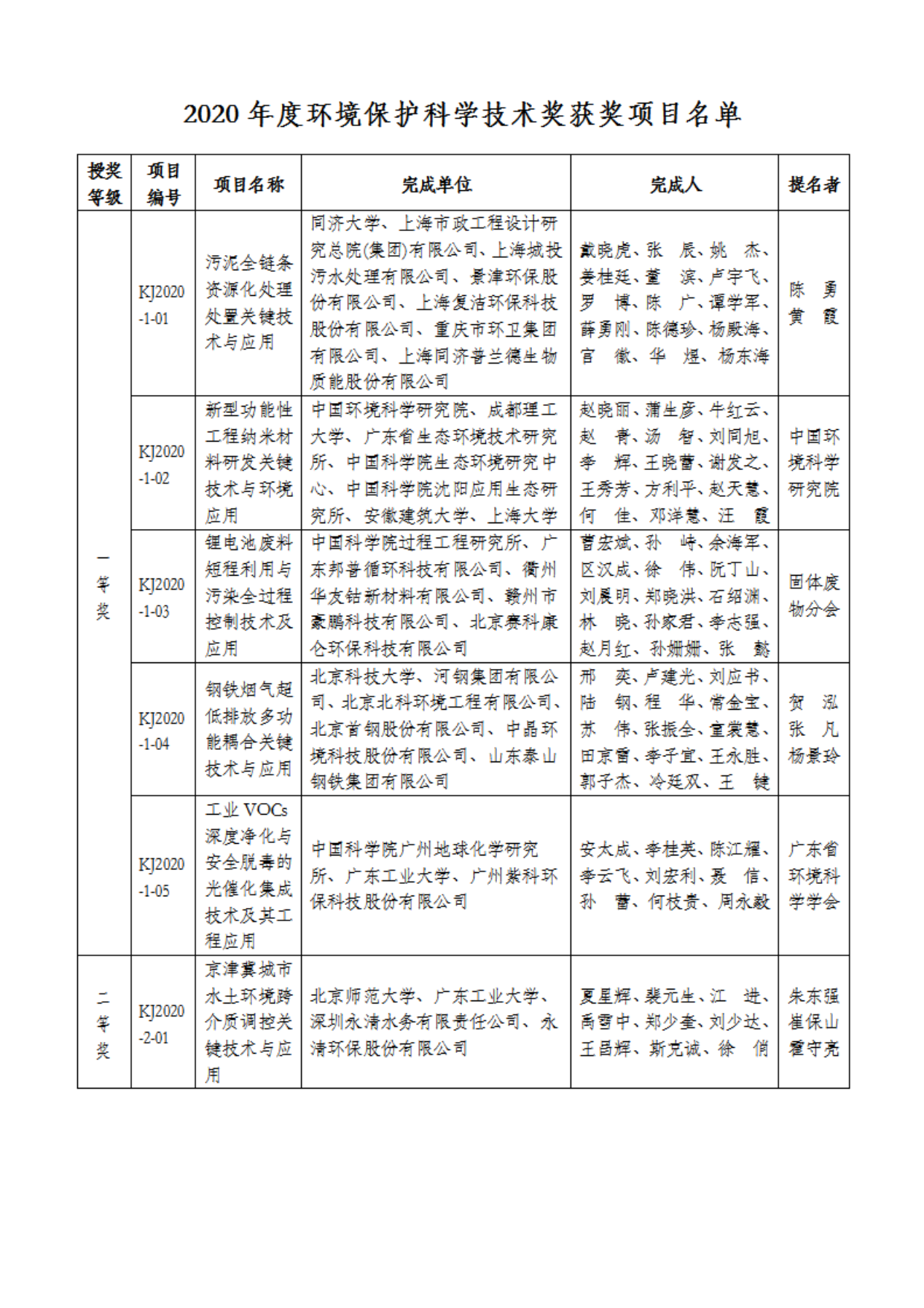 根據(jù)《環(huán)境保護科學技術獎勵辦法》的規(guī)定,經(jīng)有關專家、單位提名和專家評審,并通過廣泛公示,環(huán)境保護科學技術獎勵委員會批準44個項目獲2020年度環(huán)境保護科學技術獎,其中:一等獎5項,二等獎37項,科普類獎2項。 附:2020年度環(huán)境保護科學技術獎獲獎項目名單 環(huán)境保護科學技術獎勵辦公室 2020年12...