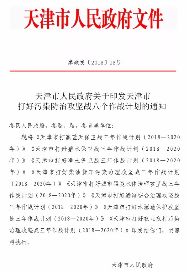 今年起三年攻堅(jiān)戰(zhàn)應(yīng)該怎么打?市劃出了最新“時(shí)間表”“路線圖”。天津市政府昨天發(fā)布《關(guān)于打好八個(gè)作戰(zhàn)計(jì)劃的通知》,標(biāo)志天津市今起全面打響藍(lán)天、碧水、凈土等三年八大戰(zhàn)役。該通知包括了藍(lán)天保衛(wèi)戰(zhàn)、碧水保衛(wèi)戰(zhàn)、凈土保衛(wèi)戰(zhàn)、柴油貨車(chē)污染治理、城市黑臭水體治理、渤海綜合治理、水源地保護(hù)、農(nóng)業(yè)農(nóng)村污染治理等8方面...
