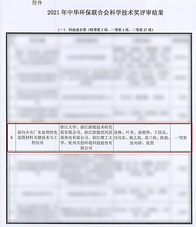 近日,由天創(chuàng)環(huán)境參與的“面向火電廠水處理的先進膜材料關鍵技術及工程應用”項目獲得中華環(huán)保聯合會“2021年度科學技術獎”科技進步獎一等獎! 項目介紹 本項目由浙江大學、浙江浙能技術研究院有限公司、浙江浙能紹興濱海熱電有限公司、浙江理工大學、杭州天創(chuàng)環(huán)境...