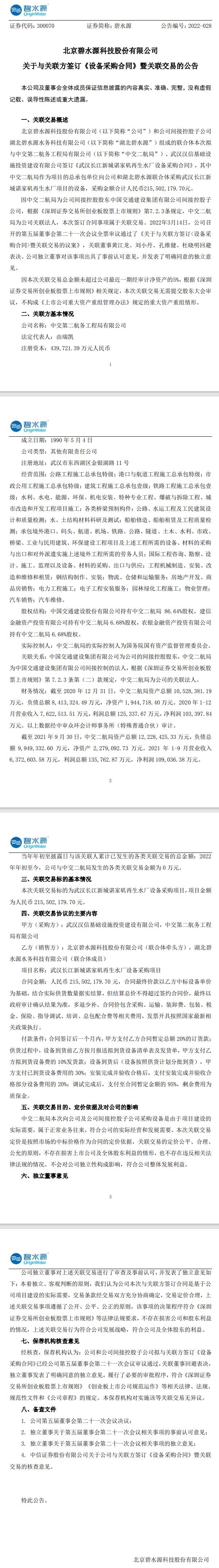 2022年3月15日,碧水源發(fā)布關(guān)于與關(guān)聯(lián)方簽訂《設(shè)備采購(gòu)合同》暨關(guān)聯(lián)交易的公告。 即北京碧水源科技股份有限公司和公司間接控股子公司湖北碧水源水務(wù)科技有限公司組成的聯(lián)合體本次擬與中交第二航務(wù)工程局有限公司、武漢漢信基礎(chǔ)設(shè)施投資建設(shè)有限公司簽訂《武漢長(zhǎng)江新城諶家磯再生水廠設(shè)備采購(gòu)合同》,其中中交二航局...