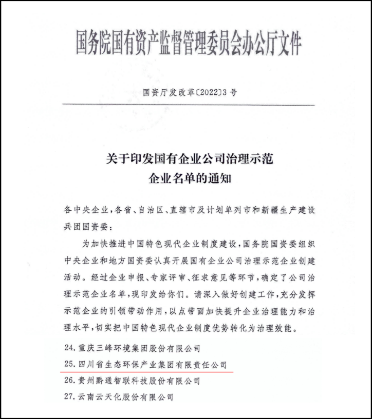 國企改革顯成效 公司治理見真章 四川生態(tài)環(huán)保集團獲評國務院國資委“國有企業(yè)公司治理示范企業(yè)” 近日,國務院國資委正式發(fā)布“國有企業(yè)公司治理示范企業(yè)”名單,四川省生態(tài)環(huán)保產(chǎn)業(yè)集團有限責任公司(以下簡稱“四川生態(tài)環(huán)保集團”)成功入選...