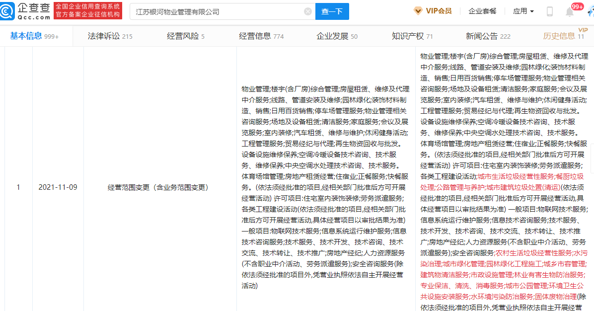 近日,中國固廢網(wǎng)從企查查獲悉,11月9日,江蘇銀河物業(yè)管理有限公司(簡稱“蘇寧銀河物業(yè)”)經(jīng)營范圍發(fā)生變更,增加了:城市生活垃圾經(jīng)營性服務;餐廚垃圾處理;公路管理與養(yǎng)護;城市建筑垃圾處置(清運);農(nóng)村生活垃圾經(jīng)營性服務;水污染治理;城市綠化管理;園林綠化工程施工;城鄉(xiāng)市容管理...