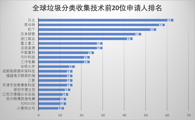 在全球垃圾收集分類領(lǐng)域?qū)@暾埩颗琶?0的申請人中,日立作為世界五百強(qiáng)綜合跨國集團(tuán)在多個領(lǐng)域處于行業(yè)領(lǐng)先地位,與專注于垃圾處理技術(shù)并發(fā)明了第一套自動垃圾收集系統(tǒng)的瑞典恩華特并駕齊驅(qū),緊隨其后的是另一家世界五百強(qiáng)企業(yè)松下。浙江聯(lián)運、啟迪桑德、以及成立于2018年并致力于將人工智能和大數(shù)據(jù)技術(shù)應(yīng)用于垃...