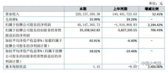 導(dǎo)語:泰欣環(huán)境于4月3日發(fā)布2018年度年報,報告顯示,泰欣環(huán)境在報告期內(nèi)實現(xiàn)營業(yè)收入 2.2億元,較上年同期增長 52.41%;凈利潤為 4014.7 萬元,比上年同期增長 2,194.42%。 報告期末,泰欣環(huán)境凈資產(chǎn) 8276.1萬元,較上年期末增長102.65%;總資 產(chǎn) 5.4億元,較上年...